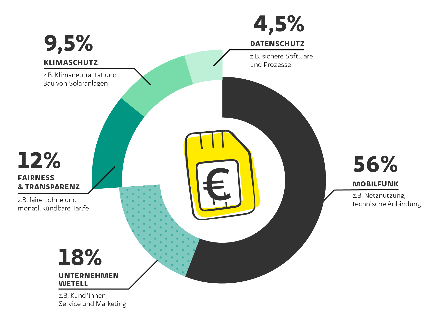 Du möchtest wissen, wie viel von deiner Tarifgebühr in die WEtell Werte fließt? Kein Problem! In unserer Preistransparenz haben wir für dich aufgeschlüsselt, zu welchen Anteilen dein Geld Klimaschutz, Datenschutz, Fairness und Transparenz zugutekommt. Kurzfassung: Es sind rund 25%!