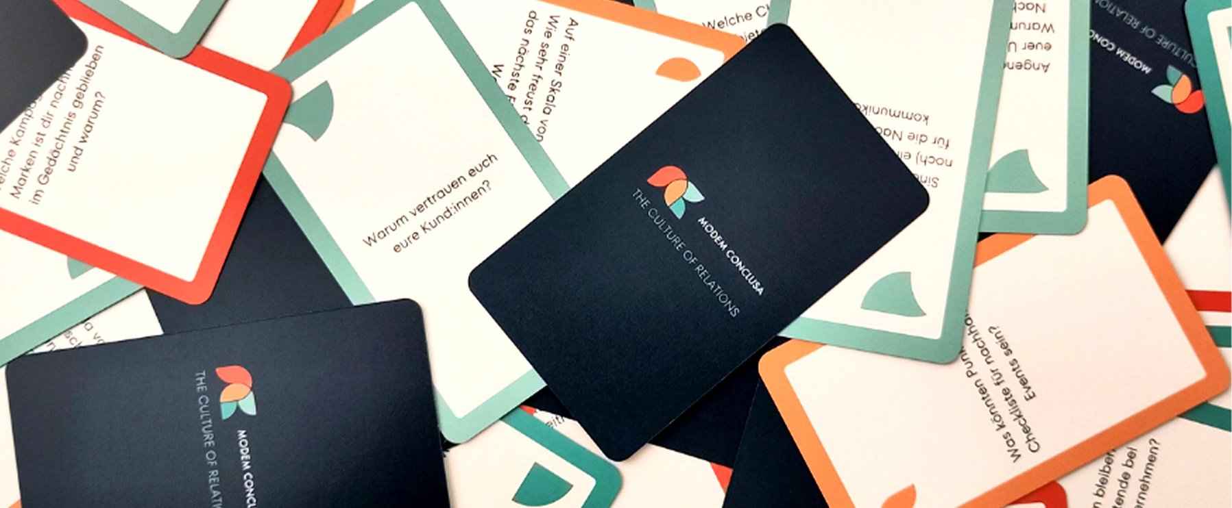 Das modem conclusa Kartenspiel bringt Fragen auf. Anhand dieser Fragen können Unternehmen lernen, was die wirklich relevanten Aspekte ihrer Kommunikation (intern wie extern) sind.